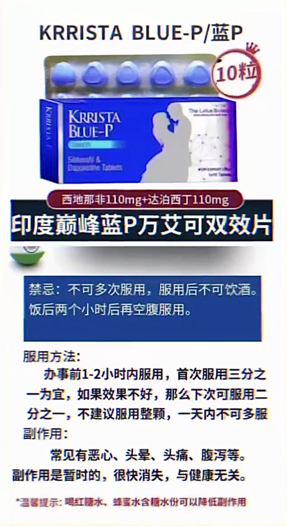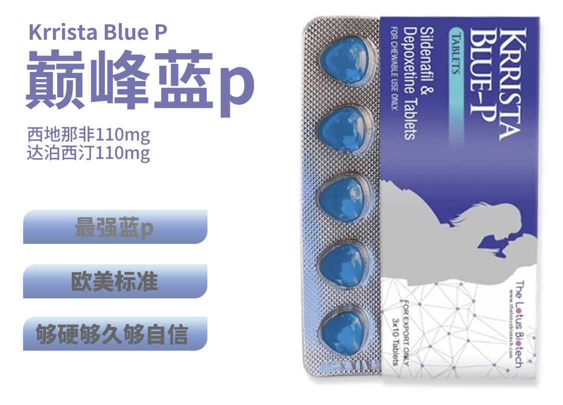 ◾️巅峰蓝P(双效) 用于解决男性勃起和早泄的药物,由凯瑞斯坦药业出品,在欧美畅销多年,以精良品质和稳定药效赢得了广泛的用户信赖,高硬度高延时,适合严重早泄追求猛的用户。 ◾️成分:西地那非110mg+必利劲110mg ◾️效果:助勃增硬+延时 ◾️特点:药效稳定 高硬度 高延时 ◾️规格:一盒10粒