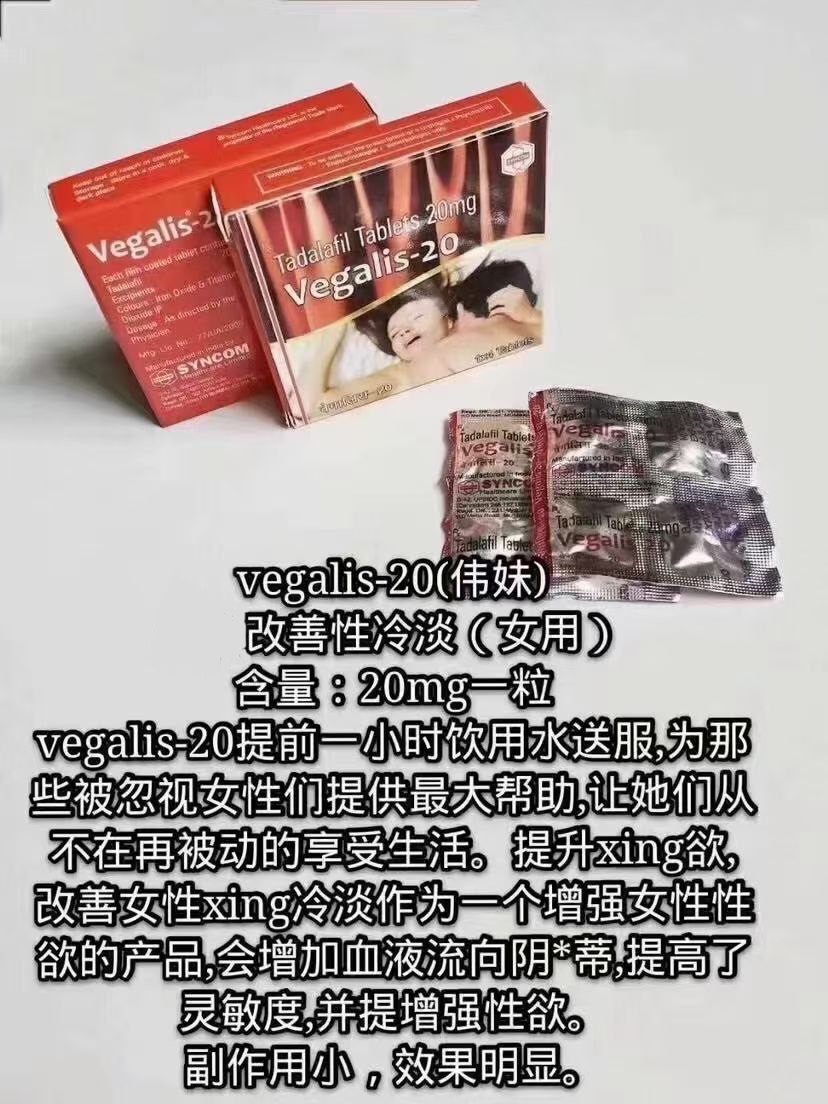 ◾伟妹 印度产Vegalis-20mg(超级) ◾【产品规格】: 4粒/盒【主要成分】:Tadalafil 20mg ◾【产品功效】: 用于提高女性性敏感度,改善性欲冷淡 ◾【用法用量】:事前1小时一杯水吞服 1次1-2粒 ◾重要提醒:不是催情药物 不是催情药物 会提升你和他的夫妻生活质量,事实上近46%女性没有在性生活中得到满足,所以才会有很多“床上演员”。 1:提高敏感度,提高对房事的能力和质量 2:增强欲望,激发高cao 3:促进霍尔蒙分泌,激发女性潜能。 4:增加女性魅力,对其更加热忱,促进和谐的夫妻生活 5:适用人群: 长期性冷淡女性。 6:作用: 快速提高女性欲望,放大性感觉,增加性爱快感,容易多次性高潮治疗女性性冷淡