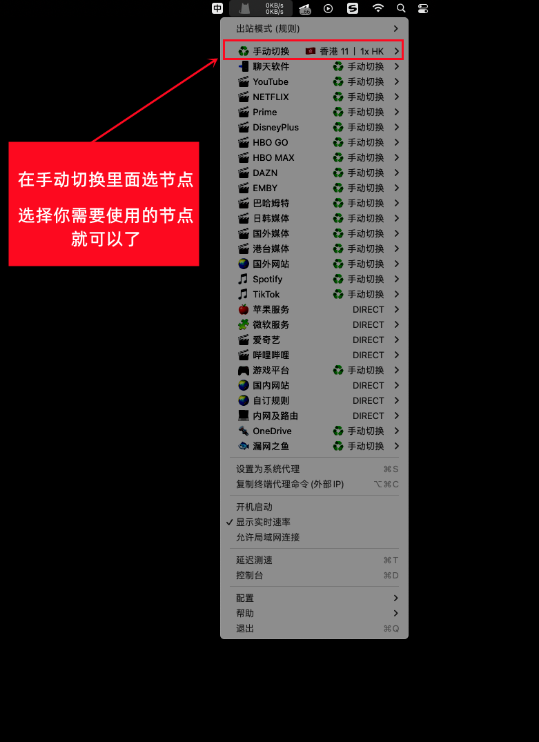 节点出来后,我们在手动切换里面选择需要使用的节点