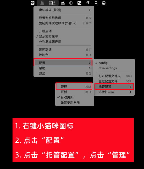安装完毕后,我们在桌面右上角找到一个猫咪图标,右键打开菜单